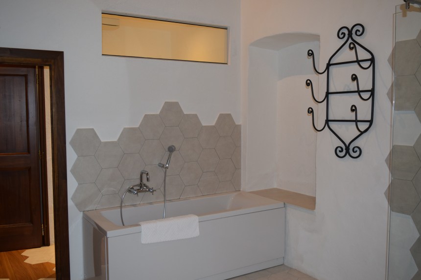 The suite offers all the typical accoutrements necessary for a splendidly comfortable stay.  There is nothing that has been forgotten.  The huge bathroom, equipped with a large washing basin, bathtub and glass shower is a place you can easily spend time pampering yourself.  Modern tiling and fixtures mix well with extremely high, wood beamed ceilings giving the space an open, airy, yet comfortable feel.