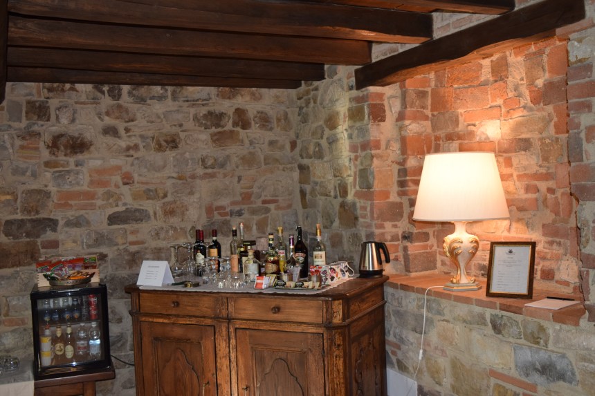 Between the Ghirlandaio Suite and The Catherine of Sienna Suite is a lovely living room with an honesty bar, and a fireplace.  The sound of the abbey bells dance down the chimney, making my heart skip a beat.  Yes, I’m really in a tiny village in Tuscany, my brain squeals with delight.